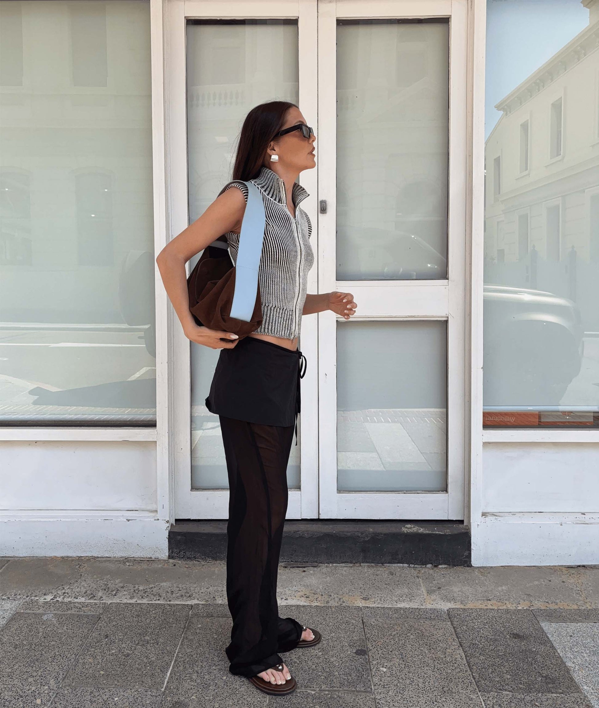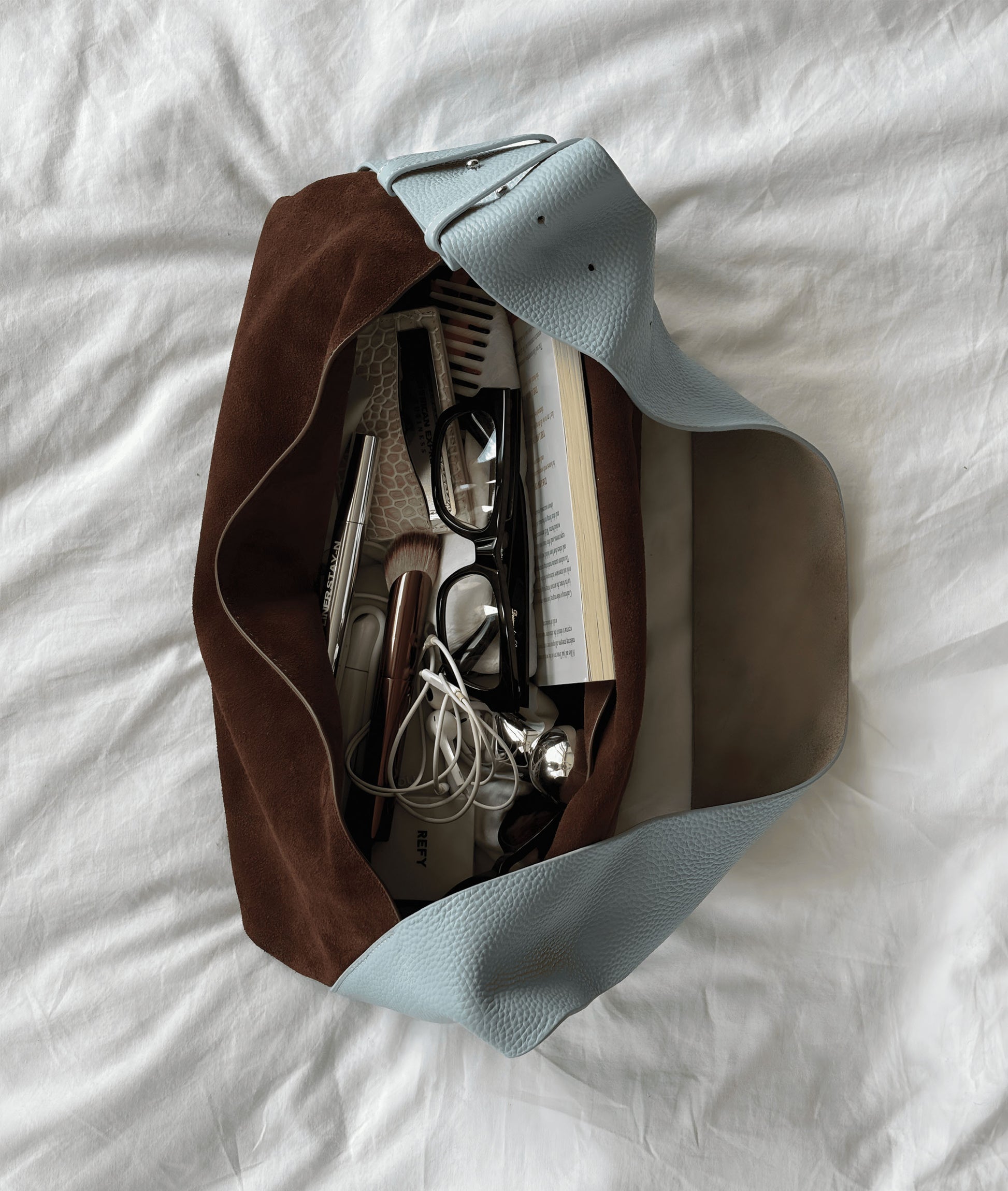 A medium-sized, slouchy shoulder bag in walnut suede with a sky blue pebbled leather strap. Designed with a magnetic closure, adjustable strap, and internal pocket, it's where function meets chic.